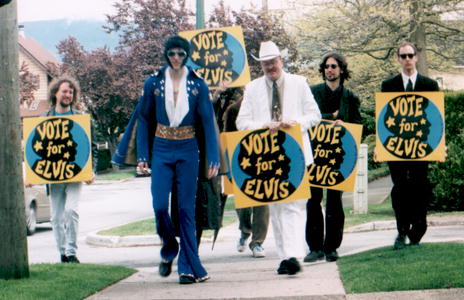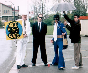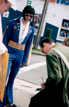 The people of Davie St. are used to seeing a lot of strange things. For instance, it is common to find 6'+ ladies with small busts, small hips and large adam's apples on nearly every block. Only in the military will you see such a high concentration of people with short hair and moustaches as on Davie. If there is such a thing as the ultimate circus of eccentricity, it can be found in the simple produce shops of Davie. Quite frankly, the King passed though this distict in his Las Vegas finery and a singing, sign waving mob practically unnoticed.