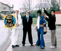 Near 3:00 they were back at the bridge and were just embarking on the return crossing when a man in a white van hailed them identifying himself as a reporter with U-TV (a popular Vancouver television station) They returned to the north end of the bridge where The King granted an interview and explaned in undisputable terms why it was right for the people to elect him. The video clip is available in AVI format (4.5Mb). The reporter was infact a very nice fellow who was kind enough to shoot and edit the story in such a way as to make the entourage which was by this time only 4 people look like a fervent mob. |