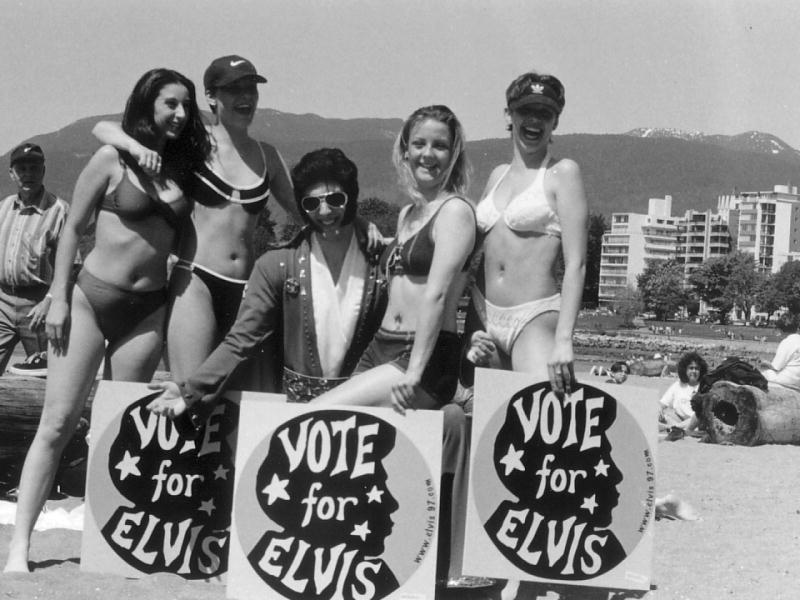 On the campaign trail at English Bay. Elvis shows that you don't need a wetsuit to get the babes.